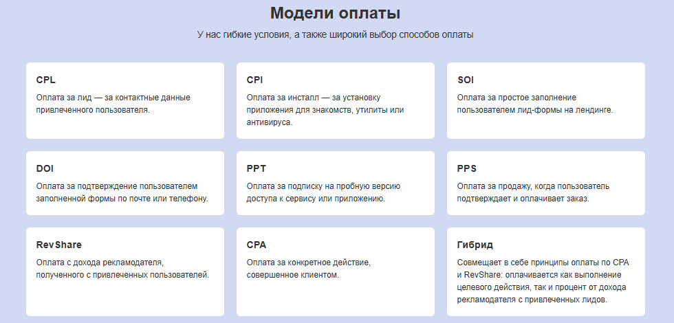 В партнерской сети гибкие условия и конкурентные ставки, которые растут при стабильном трафике. Доступны следующие модели оплаты: